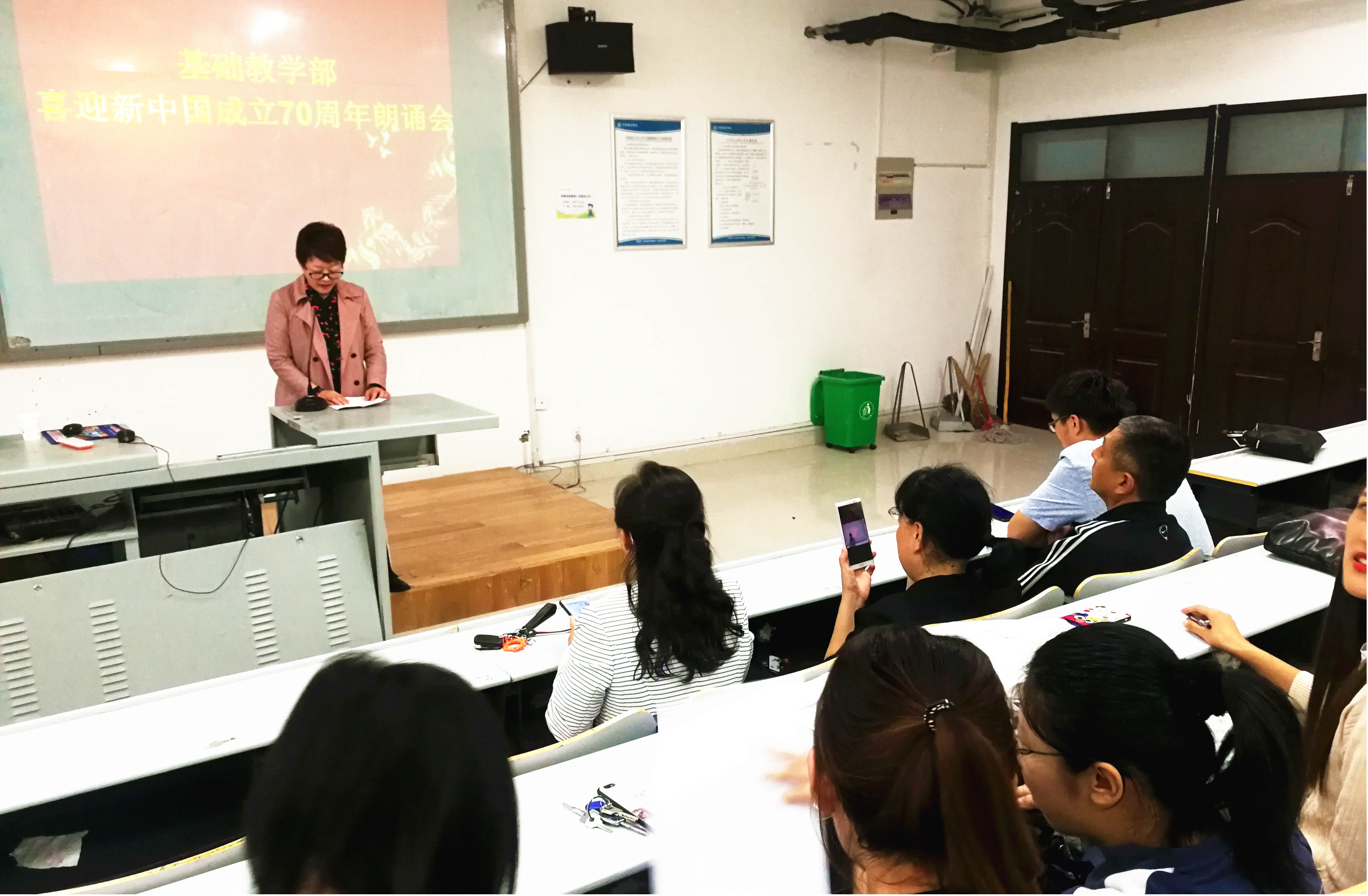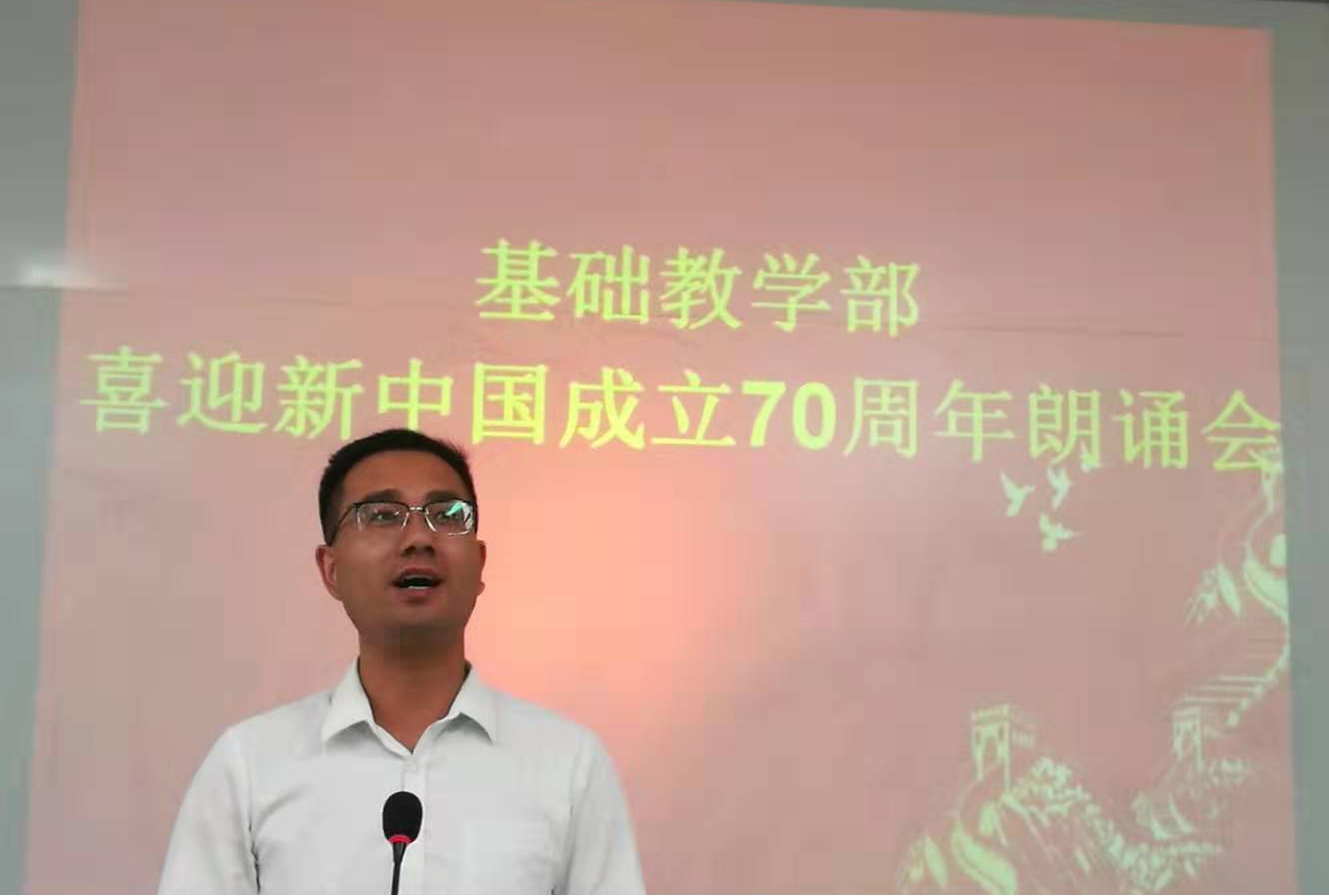 为弘扬基础教学部全体教师爱国情怀,为国庆献礼,在院党委、宣传部的部署下,基础教学部全体教师于2019年9月20日下午在5-3合堂教室举办了“喜迎新中国成立70周年朗诵会”。各教学组积极参与,为祖国母亲献上了满满的热爱之情。