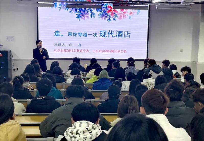 白璐向与会同学介绍了集团概况。山东舜和酒店集团是一家专业从事酒店策划、投资、经营、管理的大型股份制企业,是山东省最具影响力的酒店集团之一,中华美食联盟、山东省精品旅游促进会会长单位。刘康对同学们关注的个人成长空间、薪酬待遇、实习地点、实习岗位等问题进行了详细介绍。此次宣讲洽谈是与旅游管理系合作成立舜和酒店管理精英班,为2021级同学们开辟一条通向行业顶尖领域的直通车。