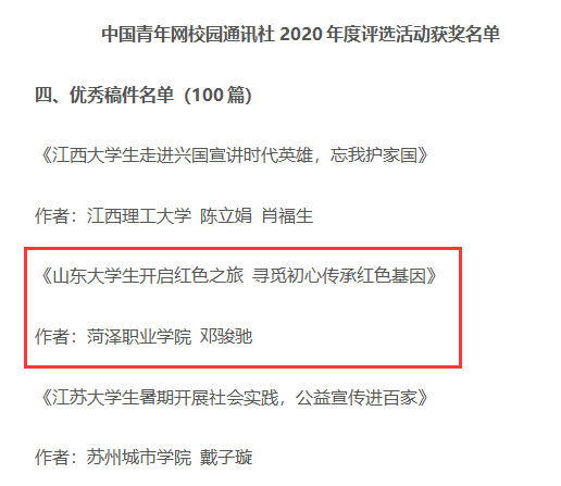近日,中国青年网发布《中国青年网校园通讯社2020年度评选活动评选结果通报》,必赢官网报送的《山东大学生开启红色之旅 寻觅初心传承红色基因》被评为优秀原创稿件。
