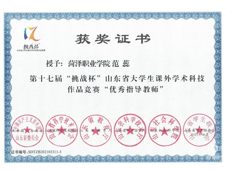 她在做好教学和班级管理工作的同时,她积极指导学生参加比赛,在第十七届“挑战杯”建设银行山东省大学生课外学术科技作品竞赛中,她指导的学生荣获特等奖,她被评为优秀指导教师。在指导学生的同时,她又积极参与科学研究,具有良好的科研素质及较强的科研能力,成果颇丰,得到了学校和社会的广泛认可。她坚持不懈、勤奋耕耘,以第一作者发表国家级学术论文7篇,参与的学术论文6篇;主持科研项目8项,其中省级7项;参与的科研项目6项,其中国家级2项,省级4项。在所研究的科研项目中,有5项荣获山东省教育科学研究优秀成果二等奖。作为一名年轻教师,她深知自己所取得的点滴成绩还远远不够,在科学领域,尚需要不断地探索和创新,不断地总结经验和突破自我,她要成为学生仰慕、同行羡慕的知识之“泉”,去浇灌出学前教育的优秀人才。