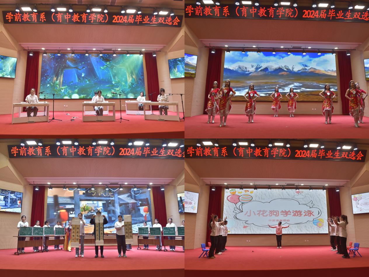 第二个阶段由2024届毕业班的同学们展现了在校学习成果。有幼儿钢琴弹唱、藏族健排舞、幼儿舞蹈、书法、简笔画、手工制作等学前教师必备的技能,还有现场模拟幼儿园主题活动《小花狗学游泳》等。精彩的展示活动充分体现了学生们对学前教育专业的热爱之情和娴熟的专业技能,展示会在全体参会人员与演职人员共同齐唱《歌唱祖国》的歌声中落下帷幕。