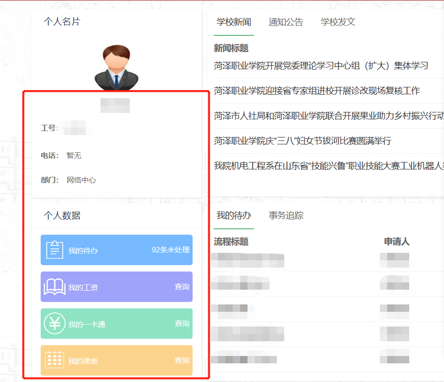 使用新密码登录信息门户登录成功,页面如下图所示,可以看到自己的工号等信息